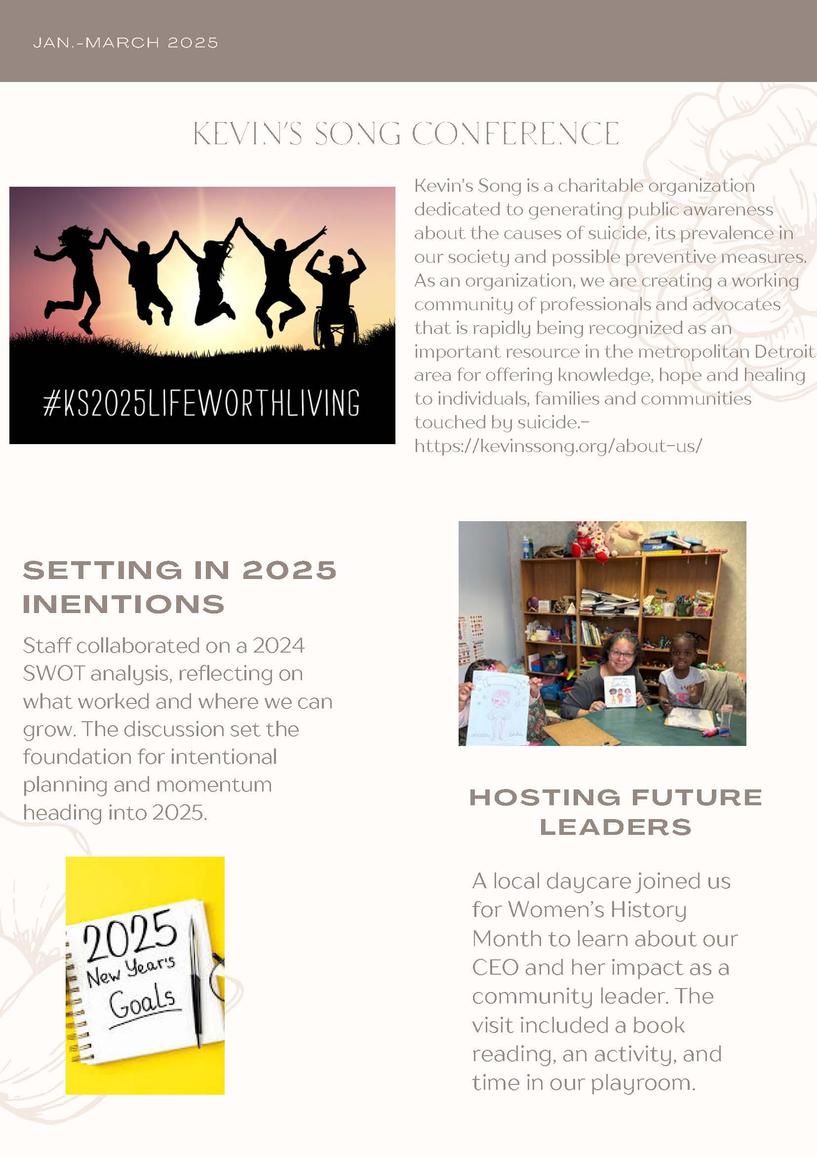 Kevin’s Song is a charitable organization dedicated to generating public awareness about the causes of suicide, its prevalence in our society and possible preventive measures. As an organization, we are creating a working community of professionals and advocates that is rapidly being recognized as an important resource in the metropolitan Detroit area for offering knowledge, hope and healing to individuals, families and communities touched by suicide.- https://kevinssong.org/about-us/